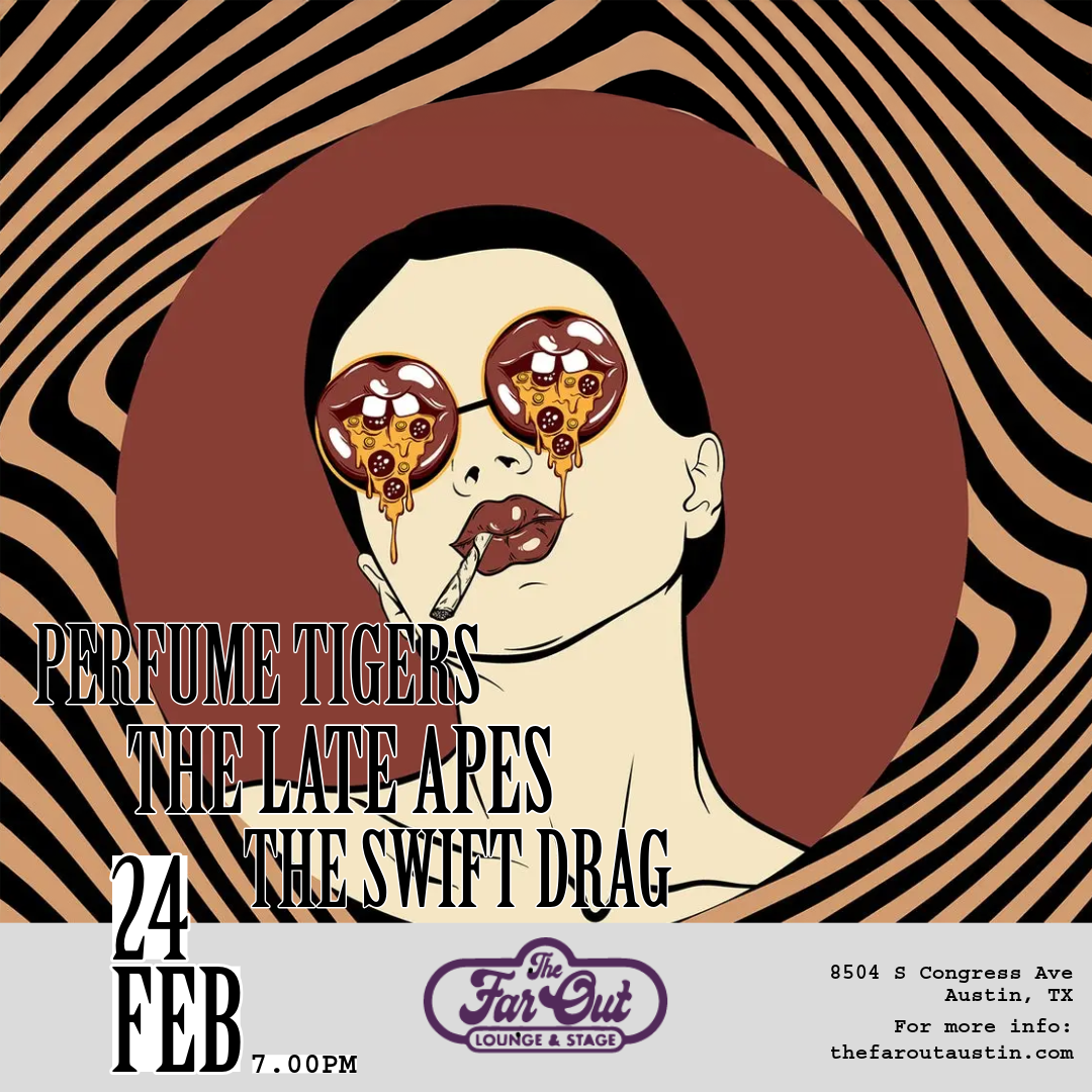Perfume Tigers headline a night at The Far Out Lounge with support from The Late Apes and The Swift Drag. Doors open at 6:00 PM on Tuesday, February 24. This is an all-ages show.